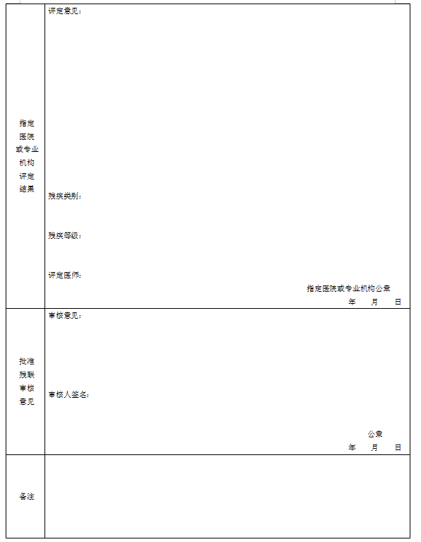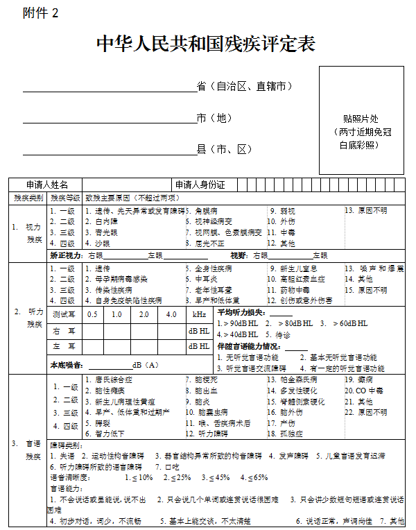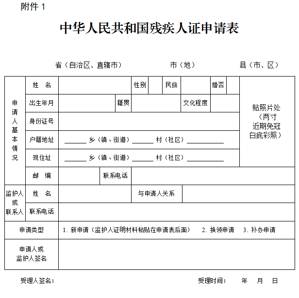 申请人提供材料齐全的予以受理,填写《中华人民共和国残疾人证申请表》(以下简称申请表,见附件1)和《中华人民共和国残疾评定表》(以下简称评定表,见附件2)。受理人将相关信息录入中国残疾人服务平台残疾人证系统(以下简称残疾人证系统),并告知申请人残疾评定的时间、地点等事项。